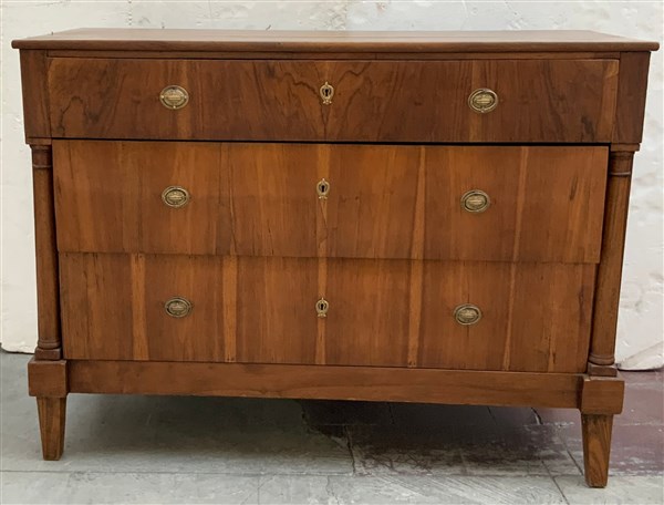 Cassettone in legno di frutto, tre cassetti sul fronte con mezze colonne, piedi rastremati. Secolo XIX ( cm127x96x55) (difetti e restauri)