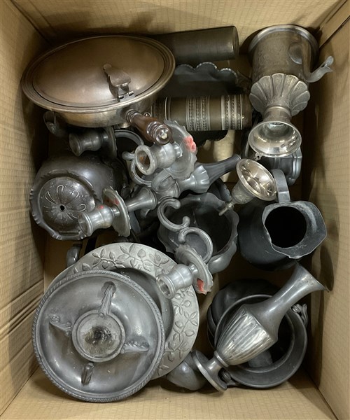 Lotto composto da numerosi oggetti in peltro e metallo (difetti)