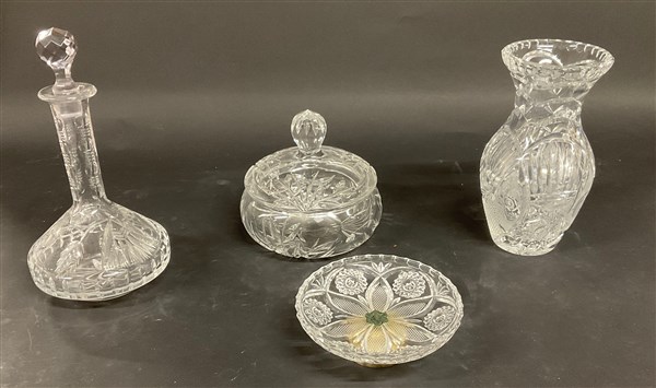 Lotto composto da un vaso, una bottiglia con tappo, una biscottiera ed un'alzatina con base in argento in vetro e cristallo molato (lievi difetti)