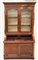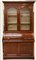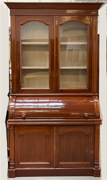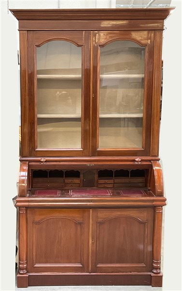 Mobile a due corpi in mogano, parte inferiore a due ante decorata con mezze colonne laterali tornite, anta ribaltabile a rullo con piano scrittoio estraibile in pelle impressa in oro,cassettini e vani. Parte superiore con due ante a vetri (cm 125x238x57) (lievi difetti)