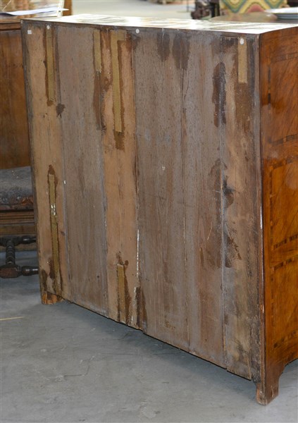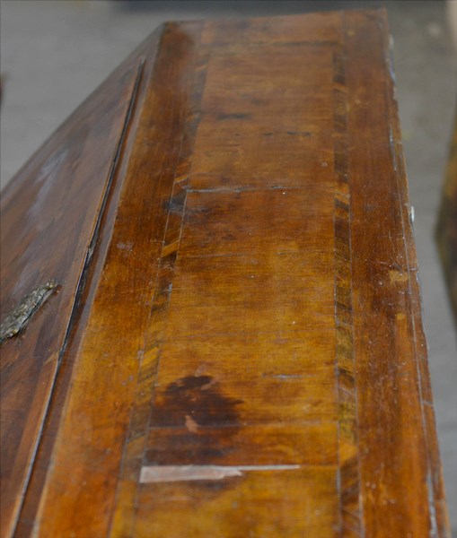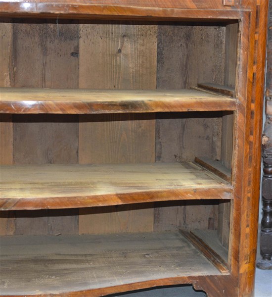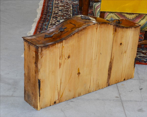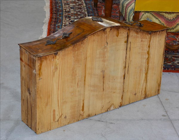 Lot 1850 | Ribalta di forma mossa lastronata e intarsiata in legni vari, fronte a tre cass