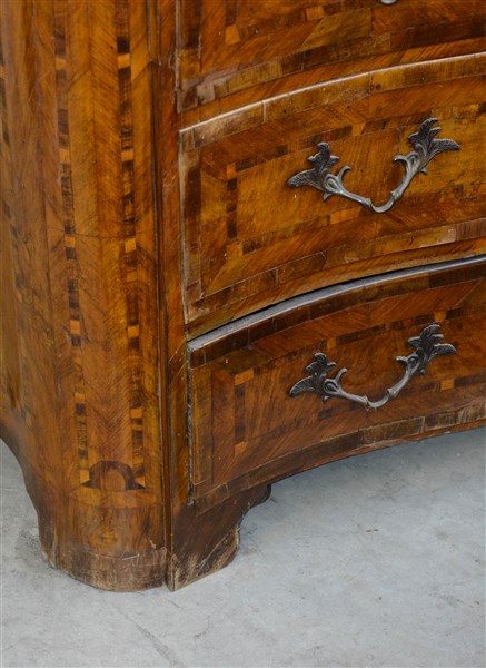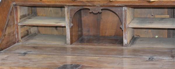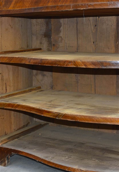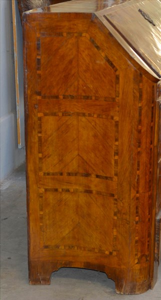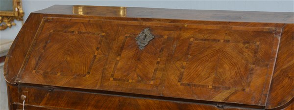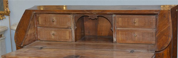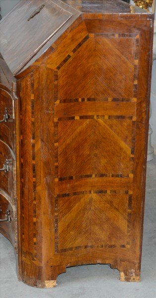Ribalta di forma mossa lastronata e intarsiata in legni vari, fronte a tre cassetti e anta ribaltabile celante vano e cassettini. Sicilia, secolo XVIII (cm 127x116x62) (mancanze e restauri)