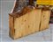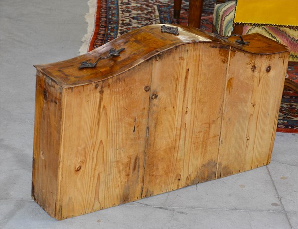 Ribalta di forma mossa lastronata e intarsiata in legni vari, fronte a tre cass