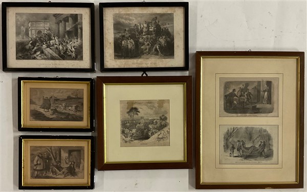 Lotto composto da sei incisioni monocrome, di autori diversi raffiguranti scene di Vita, episodi di storia romana e la cattedrale di Winchester, misure diverse, in cornici (difetti)