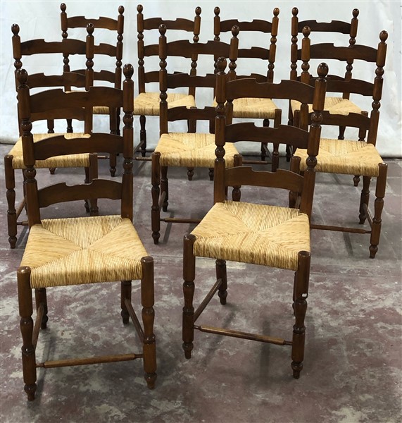 Gruppo di nove sedie in legno con gambe tornite, sedute in paglia e schienali a