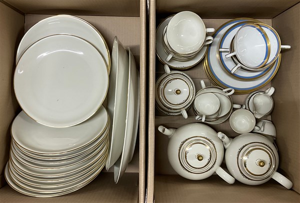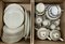 Lotto di due cartoni contenenti piatti e parti di servizi da te e caffè in porcellana (difetti)