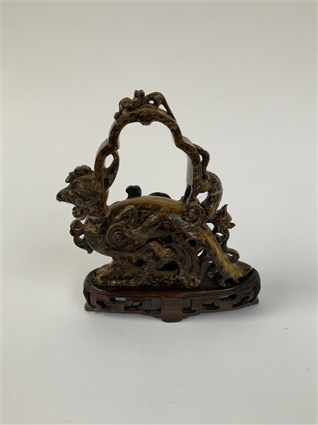 A hard stone sculpture of a fantastic beast. On wooden base