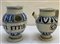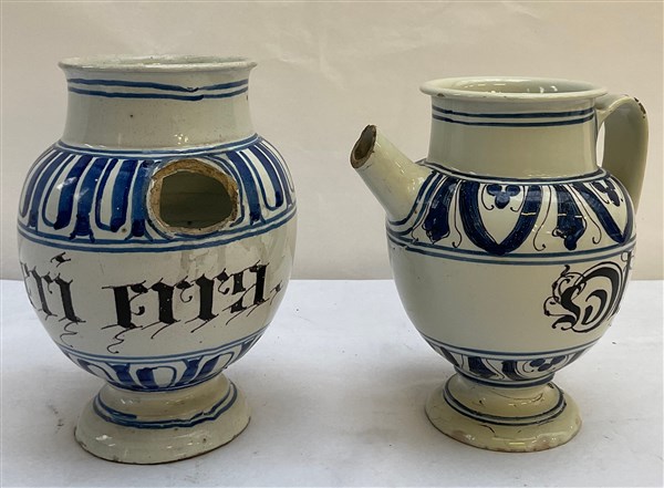 Lotto composto da due antichi versatoi da farmacia in maiolica dipinti nei toni