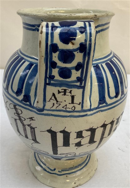 Lotto composto da due antichi versatoi da farmacia in maiolica dipinti nei toni del blu con iscrizioni recanti il nome del contenuto. Un versatoio reca l'iscrizione all'ansa "A.L 1740" (h max cm 21,5) (restauri e rotture)