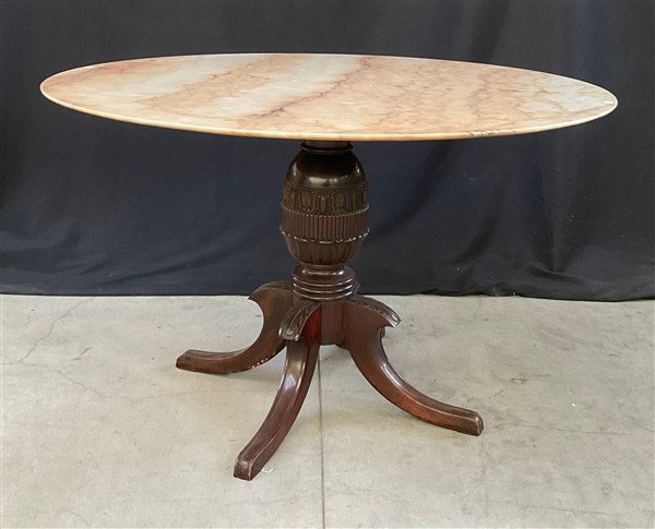 Tavolo con piano circolare in alabastro, gamba centrale in legno tornito e intagliato poggiante su quattro piedi con motivo a foglia all'attacco (d. cm 127; h. cm 77) (lievi difetti)