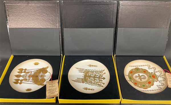Morbelli Arte, gruppo di tre piatti decorativi in porcellana policroma e oro della serie "Gioiello" (d cm 19,5), in custodie