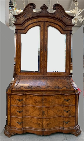 Mobile a due corpi lastronato in radica di noce con parte inferiore a tre cassetti su fronte mossa, fianchi con sportelli e ribalta celante un vano porta ghiaccio. Parte superiore a due sportelli con specchi e cimasa mossa (cm 145x254x52) (difetti)