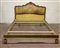 Letto con testata in legno intagliato e dorato di forma sagomata ricamata con scena galante all'aperto (cm 125x165) con cassone in legno laccato e dorato decorato a fregi e volute, piedi torniti a cipolla (difetti)