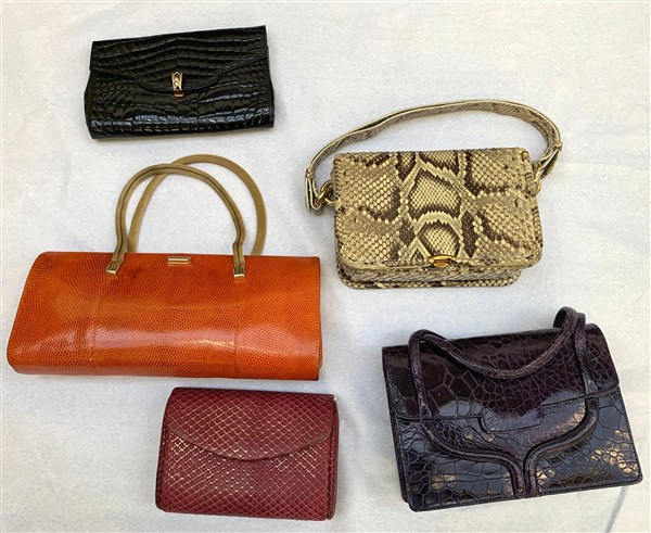 Lotto di cinque borsette a braccio o a tracolla di cui una in pitone, una in pelle di tartaruga e una in lucertola (cm max 230) (difetti e segni d'uso)