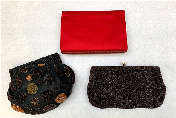 Lotto di tre borsette da sera in tessuto di raso e /o chiffon perline di diverse fatture e colori (cm max 20) (lievi difetti, segni d'uso)