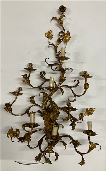 Applique a nove luci in ferro battuto e dorato a forma di ramo con foglie e fiori (h cm 101) (difetti)