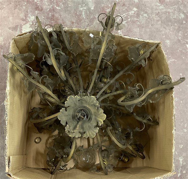 Lampadario in bronzo a diciotto bracci con pendagli in cristallo sfaccettato (d cm 75) (difetti e mancanze)