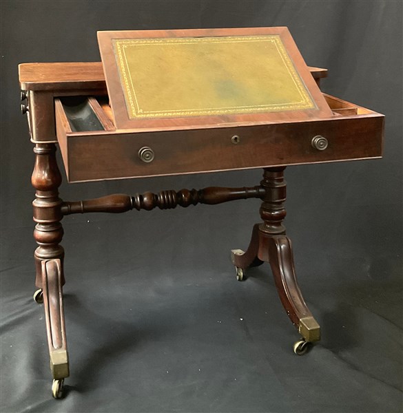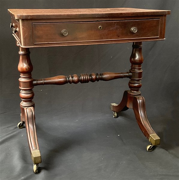 Tavolino da centro ad un cassetto nella fascia frontale celante scrittoio estraibile, gambe tornite riunite da traversa, piedi muniti di rotelle. Inghilterra, prima metà secolo XIX (cm 78x50x74) (difetti)