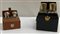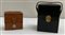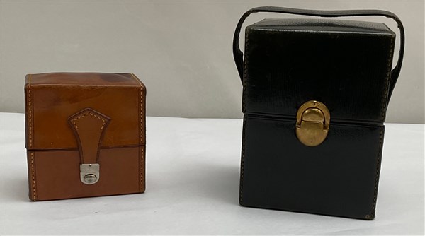 Lot comprising two sets of glass perfume bottles with metal caps within their original leather cases (defects, wear)