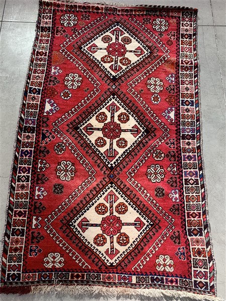 Tappeto Konia, Anatolia, secolo XX. Decoro con tre medaglioni a fondo bianco su campo rosa carico. (Difetti) (cm 220x125)