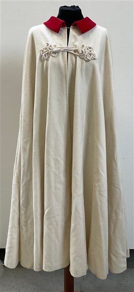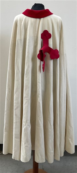 An off-white woolen cape with frogs and red velvet collar, cross of the Order of saints Maurice and Lazarus detached from garment (tg. unica) (defects, wear)