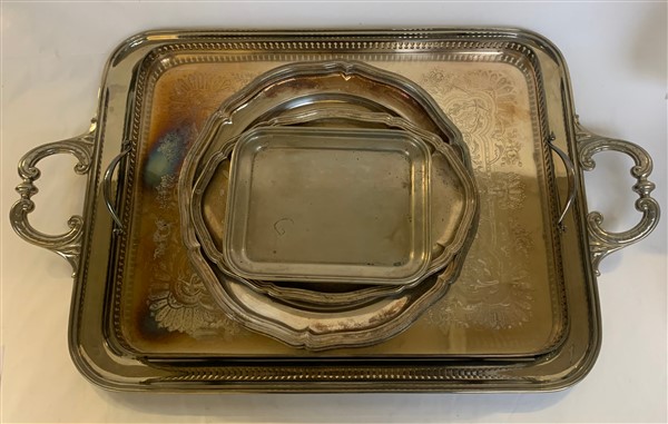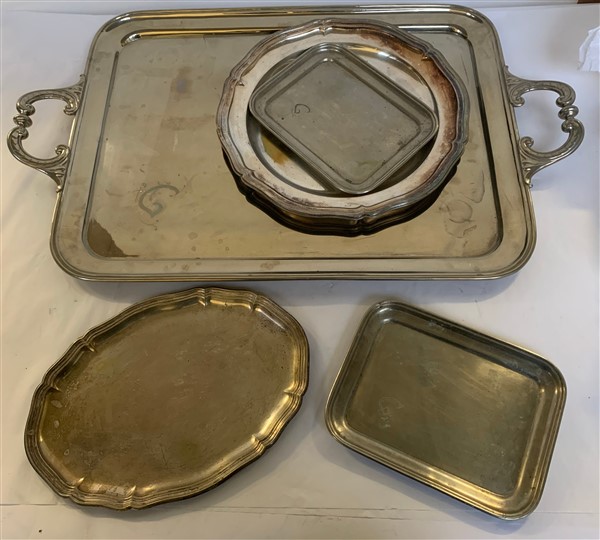 Lotto composto da due vassoi biansati, due vassoietti di forma rettangolare e due piatti da portata a bordo mistilineo in metallo e metallo argentato (cm max 75x47)