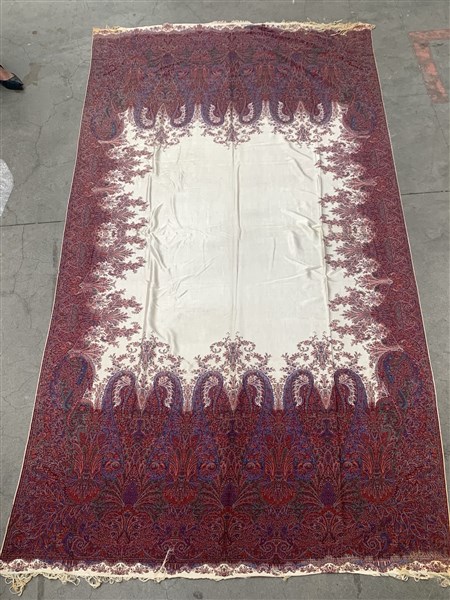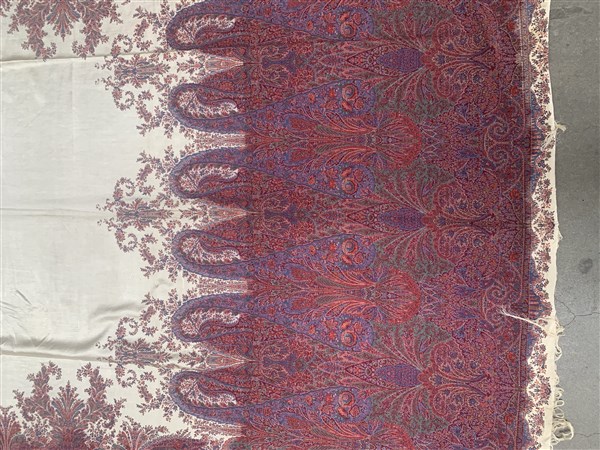Scialle Kashmir tessuto a mano in lana e seta con telaio a tiranti, Inghilterra del nord, seconda metà del secolo XIX. La grande riserva bianca è tessuta con armatura diagonale totalmente in seta. Decoro floreale con volute e pamplini lungo i bordi (cm 350x161) (difetti)