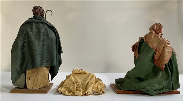 "Sacra Famiglia" tre figure da presepe in terracotta e cartapesta (Vergine h. cm 23,5; Gesù Bambino cm 20x8x16; San Giuseppe h. cm 29) Due firmate (difetti)