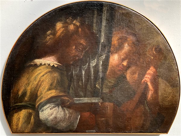 Scuola del secolo XVII "I suonatori" olio su tela sagomata (cm 56,5x77) (dife