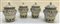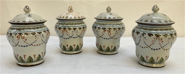 Gruppo di quattro vasi da farmacia decorati in policromia con foglie e festoni, profilati in marrone. Con coperchi non pertinenti (h cm 14) (difetti e restauri)