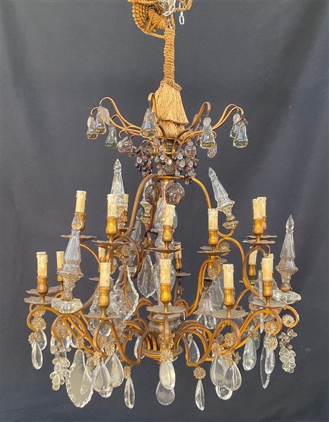 Lampadario a diciotto luci con struttura in bronzo dorato decorato a pendenti in vetro a forma di grappoli d'uva, frutti, foglie e fiori. Secolo XIX (cm 100x90 circa) (mancanze e difetti)