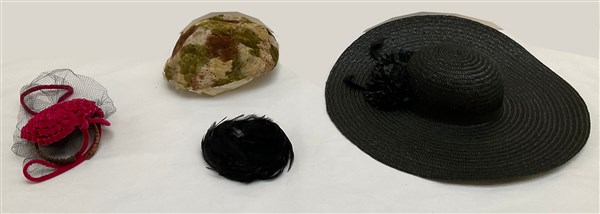 Lotto di quattro copricapo: due fascinator, uno in velluto color ciliegia con veletta e uno in piume nere, un cappello in paglia color nero e un cappellino ricoperto in piume nei toni del verde salvia, beige e tabacco (lievi difetti, segni d'uso)
