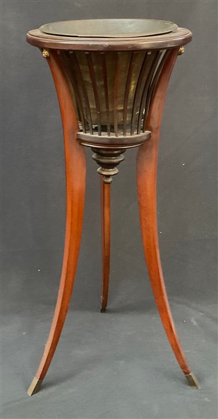 Portavaso tripode in legno lastronato in mogano, gambe a sciabola decorate all'attacco da protomi leonine in metallo dorato, piedi muniti di scarpette. Inghilterra, secolo XIX (d. cm 35xh. cm 81) (difetti)