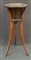 Portavaso tripode in legno lastronato in mogano, gambe a sciabola decorate all'