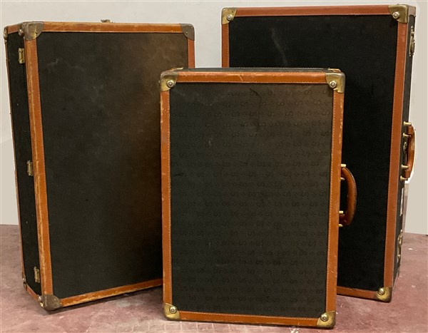 Set di tre valigie in tessuto nero con profili in cuoio color tabacco (difetti)