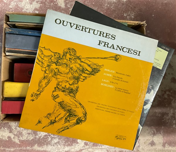 Cartone contenente numerosi vinili in custodie di generi musicali differenti (difetti)