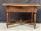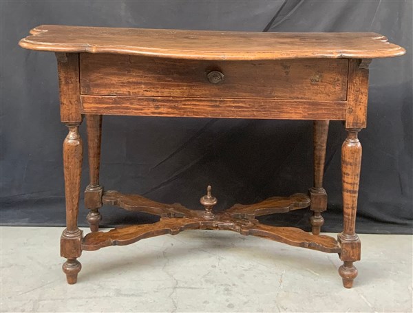 Tavolo da parete in noce con piano sagomato ad un cassetto nella fascia, gambe tornite riunite da traverse. Secolo XVIII (125x75,5x60) (difetti e restauri)