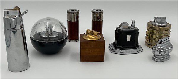 Lotto di otto accendini da tavolo di forme e materiali diversi (difetti e mancanze)