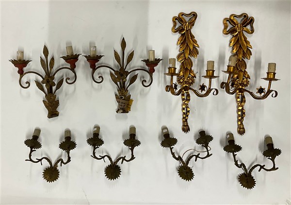 Lotto di otto applique a due luci in ferro e legno di fatture ed epoche differe