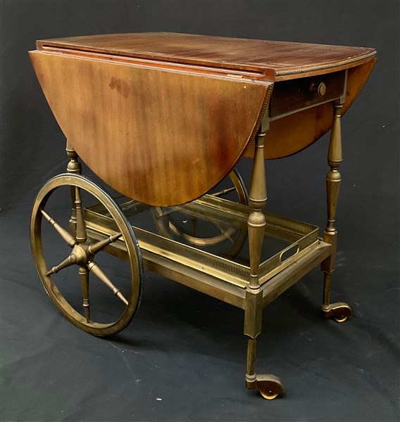 Carrello portavivande con struttura in ottone, piano in legno lastronato a due alette con cassetto nella fascia. Gambe riunite da pianetto a vassoio con piedi muniti di rotelle (aperto: cm 100x69x68; chiuso cm 43x69x68) (difetti)