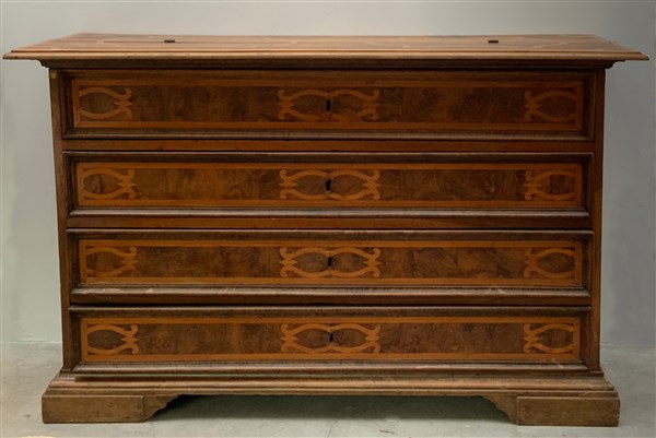Antico cassettone in legno filettato a tre cassetti, calatoia nella fascia supe