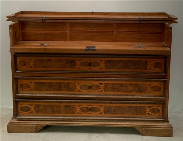 Antico cassettone in legno filettato a tre cassetti, calatoia nella fascia superiore e piano apribile celante sei cassettini , piedi a mensola (cm170x109x68) (difetti e restauri)