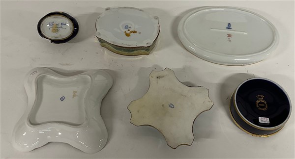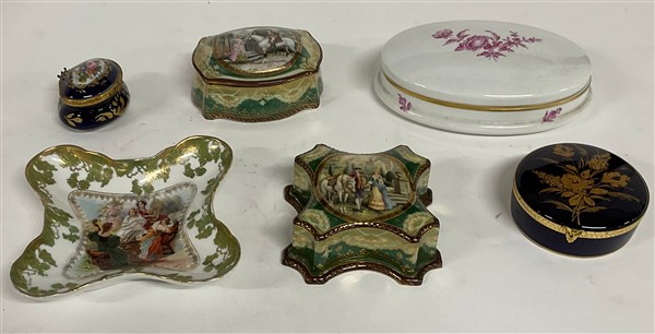 Manifatture differenti, lotto composto da cinque scatoline con coperchio e un vassoietto polilobato in porcellana dipinta in policromia fiori e scene galanti (lievi difetti)