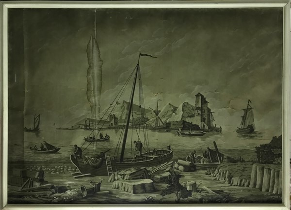 Ignoto "Veduta portuale" papier peint (cm 186x255) In cornice (gravi difetti)