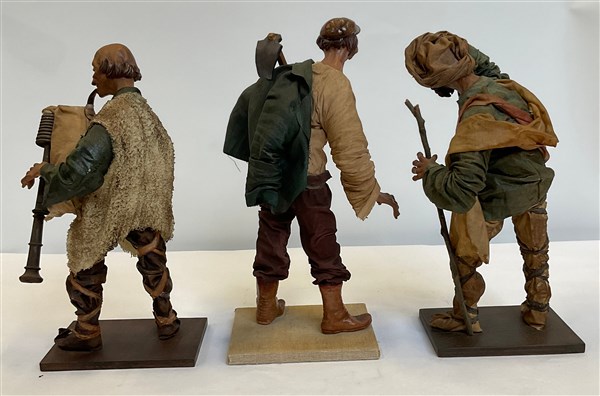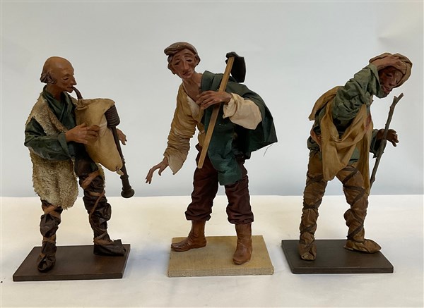 Tre figure da presepe in terracotta e cartapesta, firmate (h. max cm 30) (difetti)