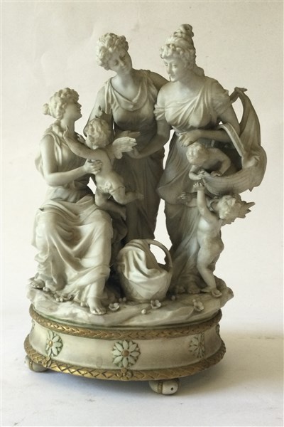Gruppo plastico in biscuit con base parzialmente dipinta raffigurante "tre Grazie con amorini" (h cm 28 ) (difetti e mancanze)