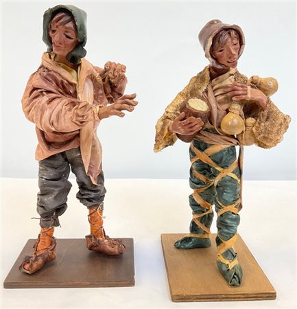 Due figure da presepe in terracotta e cartapesta, firmate (h. max cm 29,5) (difetti)