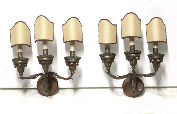 Coppia di antiche appliques a tre luci in ferro e legno intagliato e dorato (cm 40x36) (difetti e mancanze)