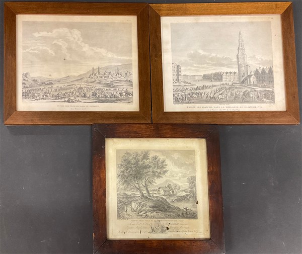 Zancon-De Santo- Berthault, gruppo di tre incisioni del secolo XIX. Due inerenti le guerre napoleonichecon riferimento all'entrata dei francesi in Olanda del 21 gennaio 1795 e in Piemonte nell'anno VII del calendario rivoluzionario (cm 23x30) e una raffigurante una "Veduta nella villa di fonte al territorio asolano" dedicata a Sua eccellenza il senatore Benedetto IIII Civran, vescovo di Caorle (1770-1776) e successivamente vescovo di Chioggia (1776-1794) (cm 23x25) in cornici (difetti)