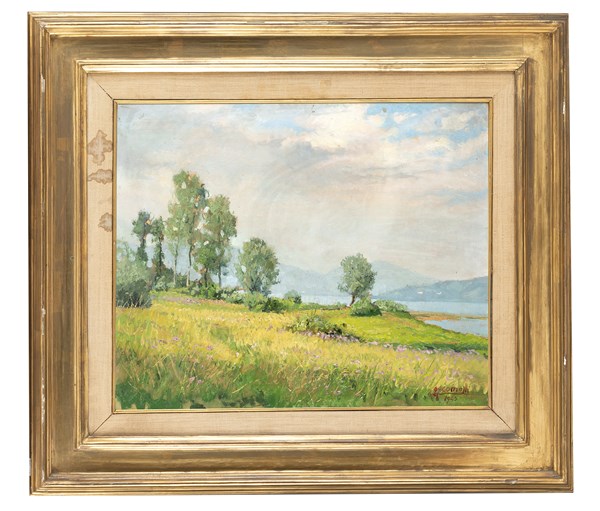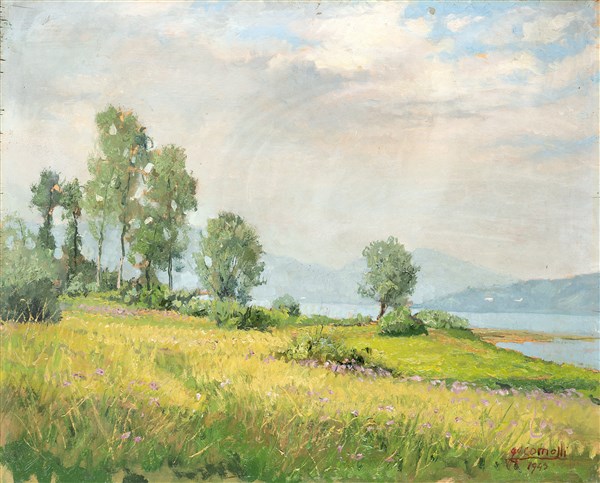Gigi Comolli "Sulle rive del Lago Maggiore" 1943 olio su compensato (cm 40x50) F